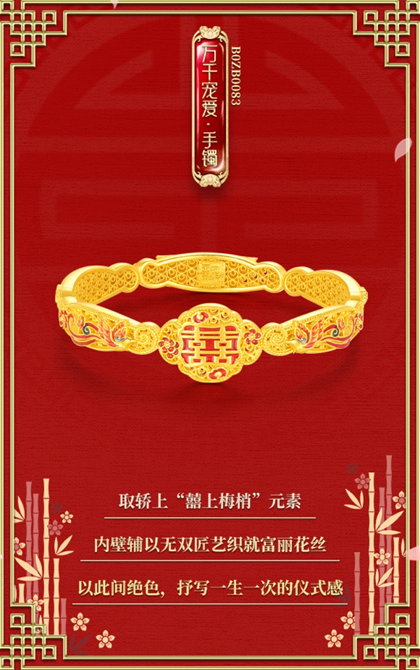 周大生宁波万工轿国家宝藏联名黄金婚嫁套系“万千宠爱”,取轿上龙、凤、牡丹等元素,打造珐琅和素金两版产品,满足不同审美需求,实现新娘对于中式婚嫁的美好期待。万千宠爱项链以喜轿为契,将吉囍元素錾刻于饰,经典如意锁与时尚花边设计相结合,辅之中式对称花丝流苏,寓意好事成双,颂祝人生喜事,诠释万千宠爱;“为君撷取钗头凤,云鬓花颜金步摇” 万千宠爱套系凤簪取轿上喜凤,缀以“囍”字流苏,凤尾灵动富丽,寄意从此三千情丝为君独挽,愿夫妻琴瑟和鸣;万千宠爱耳饰取自轿上牡丹盛放之态,以花丝织就更显立体饱满,珠链流苏轻盈精致,寓意新娘容颜美貌,姿态高贵;套系手镯取轿上“囍上梅梢”元素,内壁辅以无双匠艺,织就富丽花丝,传承中式“金凤颂喜”元素,彰显与生俱来的大气与矜贵;万千宠爱戒指则是将苏式窗柩与东方喜嫁华彩相结合,经典中式设计延续传统婚嫁的隆重端庄,兼具现代审美的优雅,美好祝福与中式风韵相映无遗,期盼花开迎富贵,吉囍以成双。